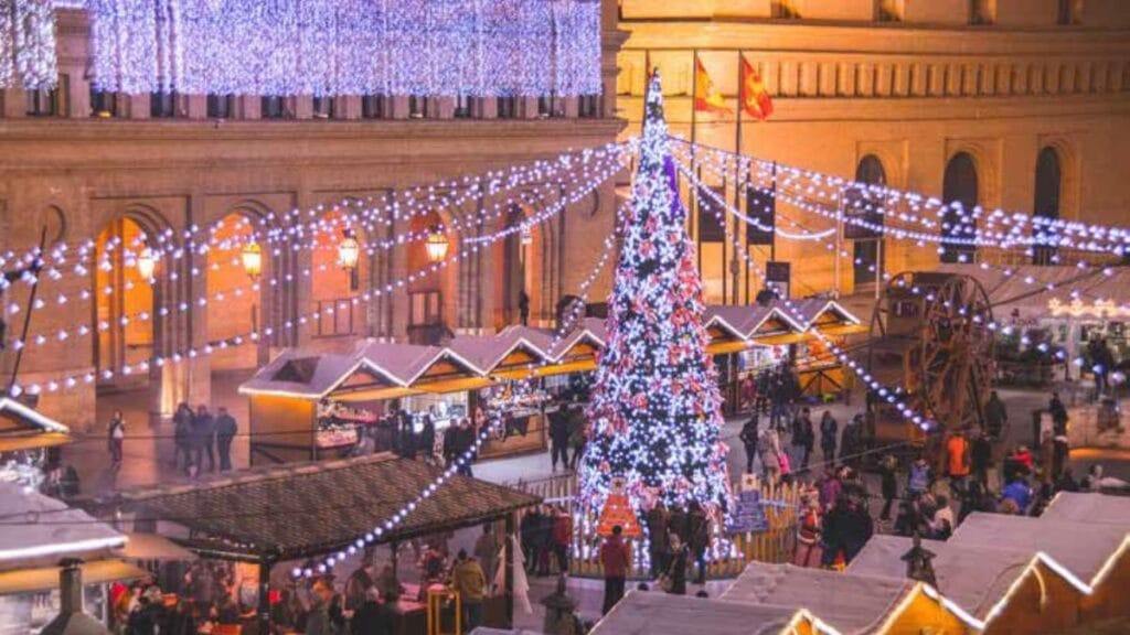 La Plaza del Pilar se transforma en un parque temático con 40 casetas, tabernas y la Casita de Papá Noel. Presume del Belén gigante más grande de España (más de 1.000 m²). Del 29 de noviembre al 6 de enero de 2026.