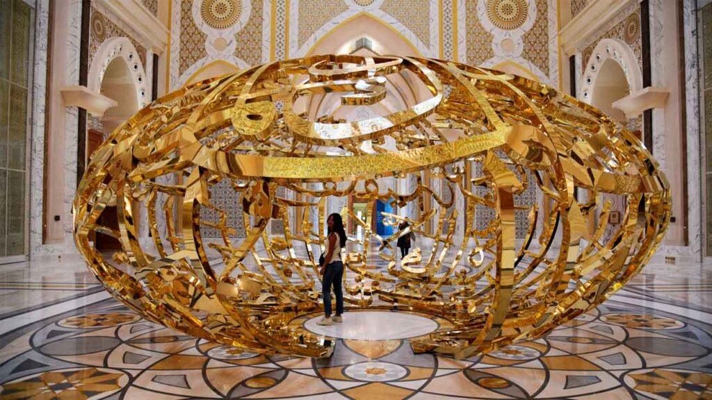 También podrás visitar una parte del ala oficial, donde se celebran reuniones de Estado. En la sala «Spirit of Collaboration», por ejemplo, se respira el mismo aire solemne que en la Mezquita Sheikh Zayed, con decoraciones que recuerdan su estilo. Muy cerca, la instalación “Power of Words” te sorprenderá con una gran escultura inspirada en frases del jeque Zayed.